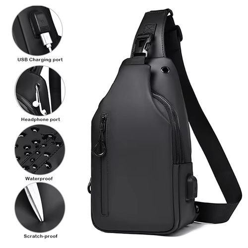 Bolsa transversal masculina para atacado com USB, portátil, moderna e casual, com acabamento em couro resistente, ideal para esportes ao ar livre.